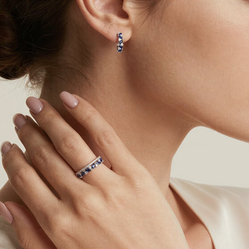 這款獨特的訂製女士結婚戒指,搭配永恆戒圈,採用雙排設計,宛如疊戴戒指,為您的珠寶收藏增添一抹精緻優雅。戒圈第一排鑲嵌閃耀的圓形白鑽,璀璨奪目。第二排則巧妙地將圓形白鑽與迷人的藍色馬眼形鑽交相輝映,為整體設計注入一抹亮麗色彩和一絲俏皮靈動。兩排寶石和諧交融,展現優雅與趣味,讓這款訂製結婚戒指成為現代新娘的完美之選。用這款精美的雙排結婚戒指,見證你們的愛情故事。
